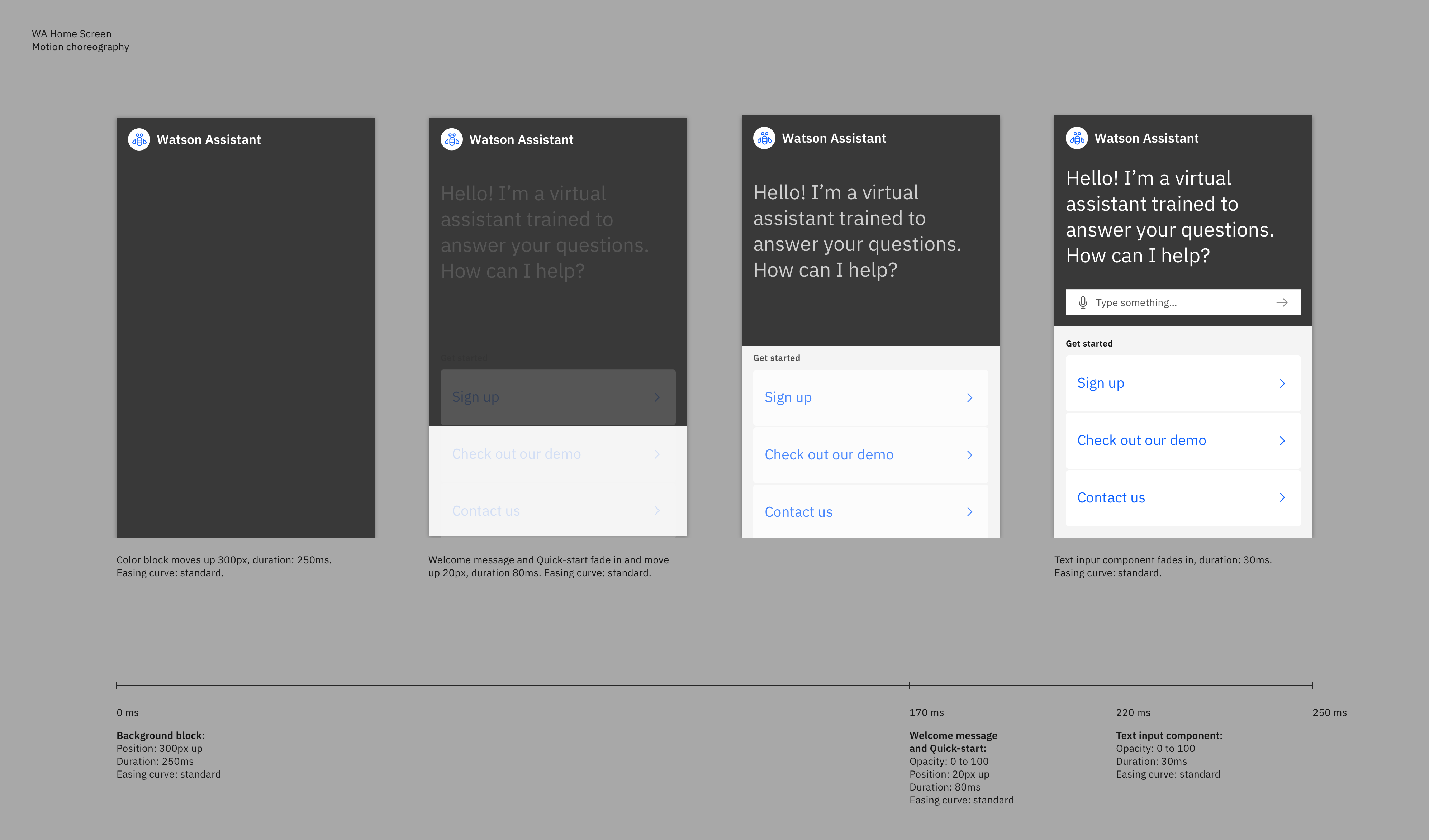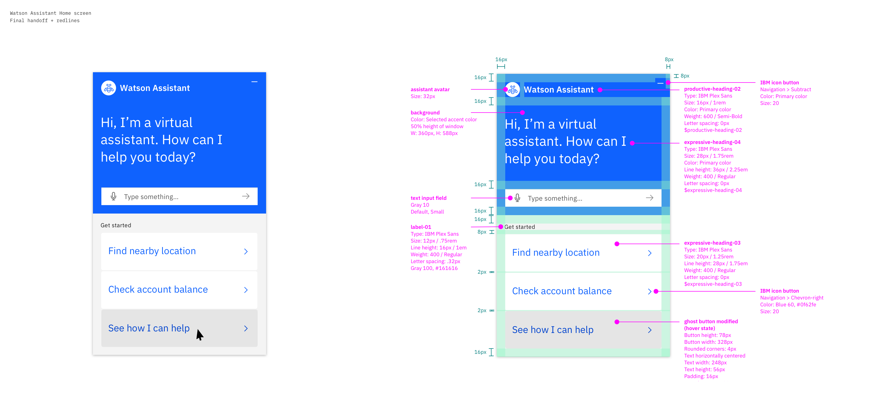 In 2020, I had the opportunity to help design the home screen for Watson Assistant, IBM’s virtual assistant. I worked closely with the design lead, development team, and project manager to define a welcome experience for Watson Assistant. I contributed new interactive components and created a customizable home screen that shipped in August 2020.