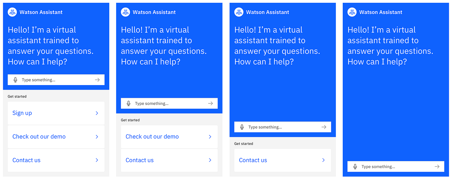 Using a solid color to separate the home screen from the web page, creates a visual separation within the z-space to help provide a clear and straightforward interaction with the virtual assistant. The block of color makes use of the selected primary color (determined by the user/creator) and simplifies the process of customization.